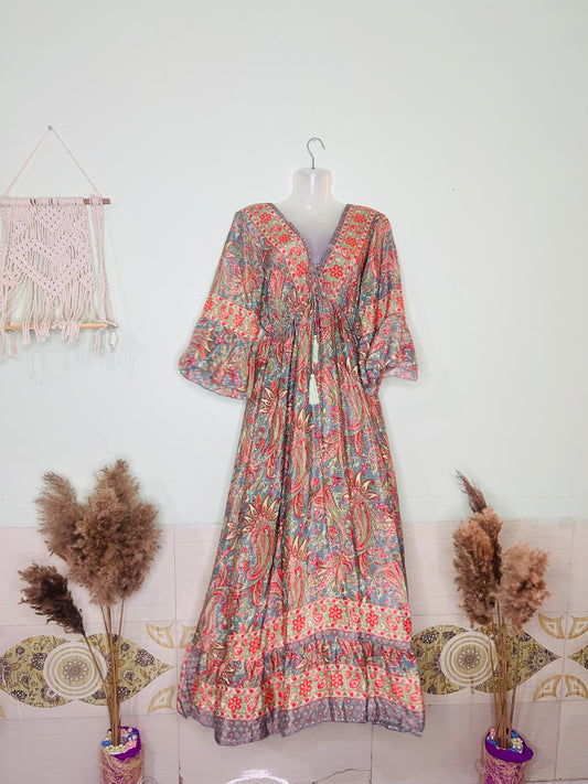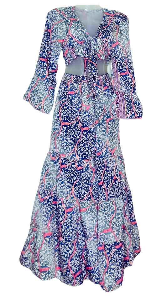 Pastel Coral & Sky Blue Printed Boho Maxi Dress
