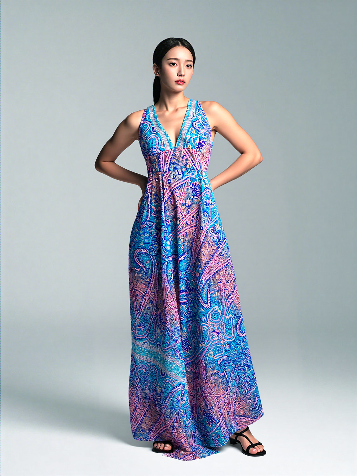serene water blue meets soft blush pink, kissed with a subtle touch of gold. This elegant halter neck silk gown flows like a dream, designed to give you a graceful, feminine silhouette. Perfect for day weddings, festive brunches, or beachside soirées – it’s light, luxe, and effortlessly eye-catching.