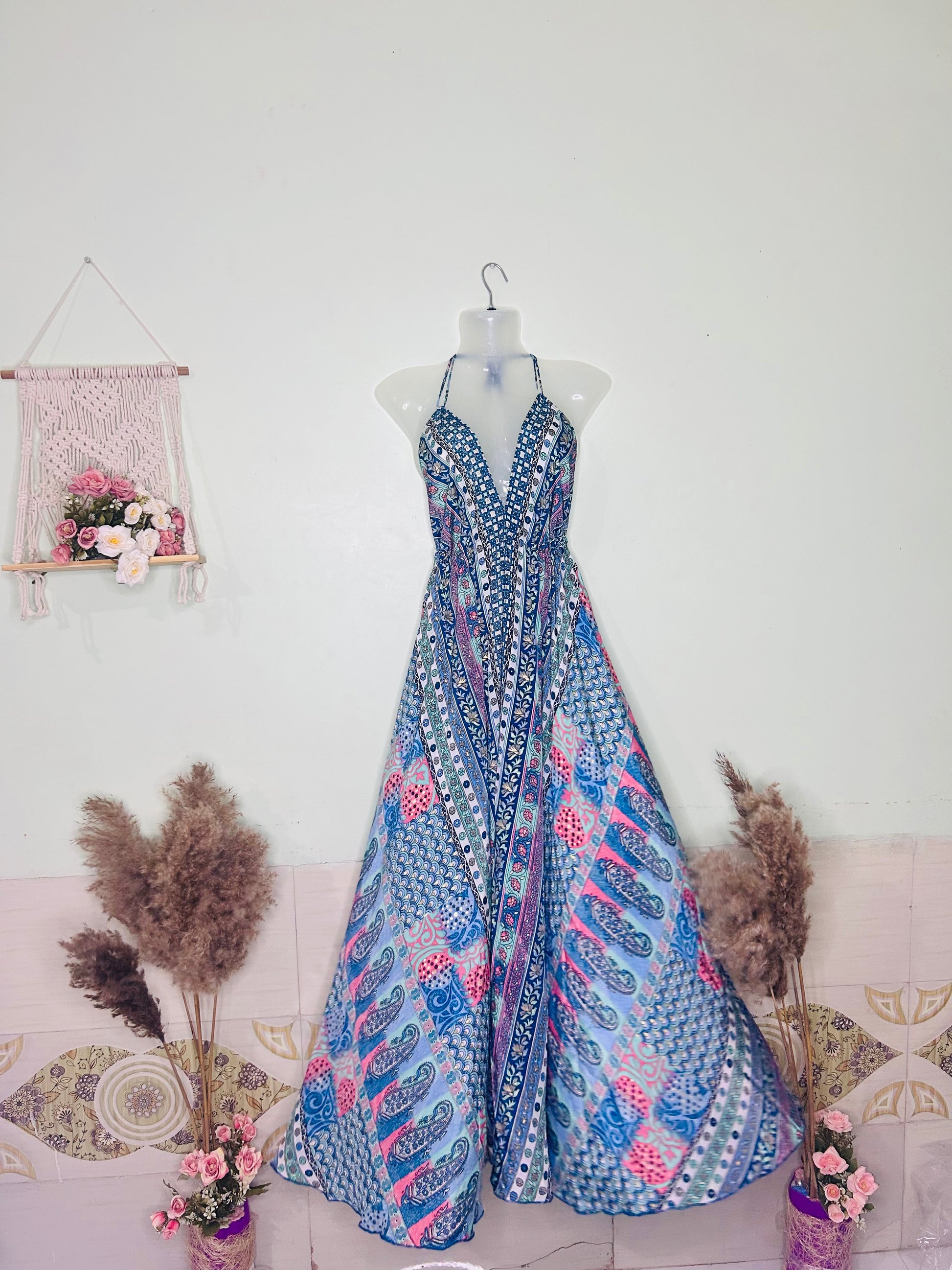 Boho Bliss Silk Gown – Pink & Blue Halter Neck Beach Dress