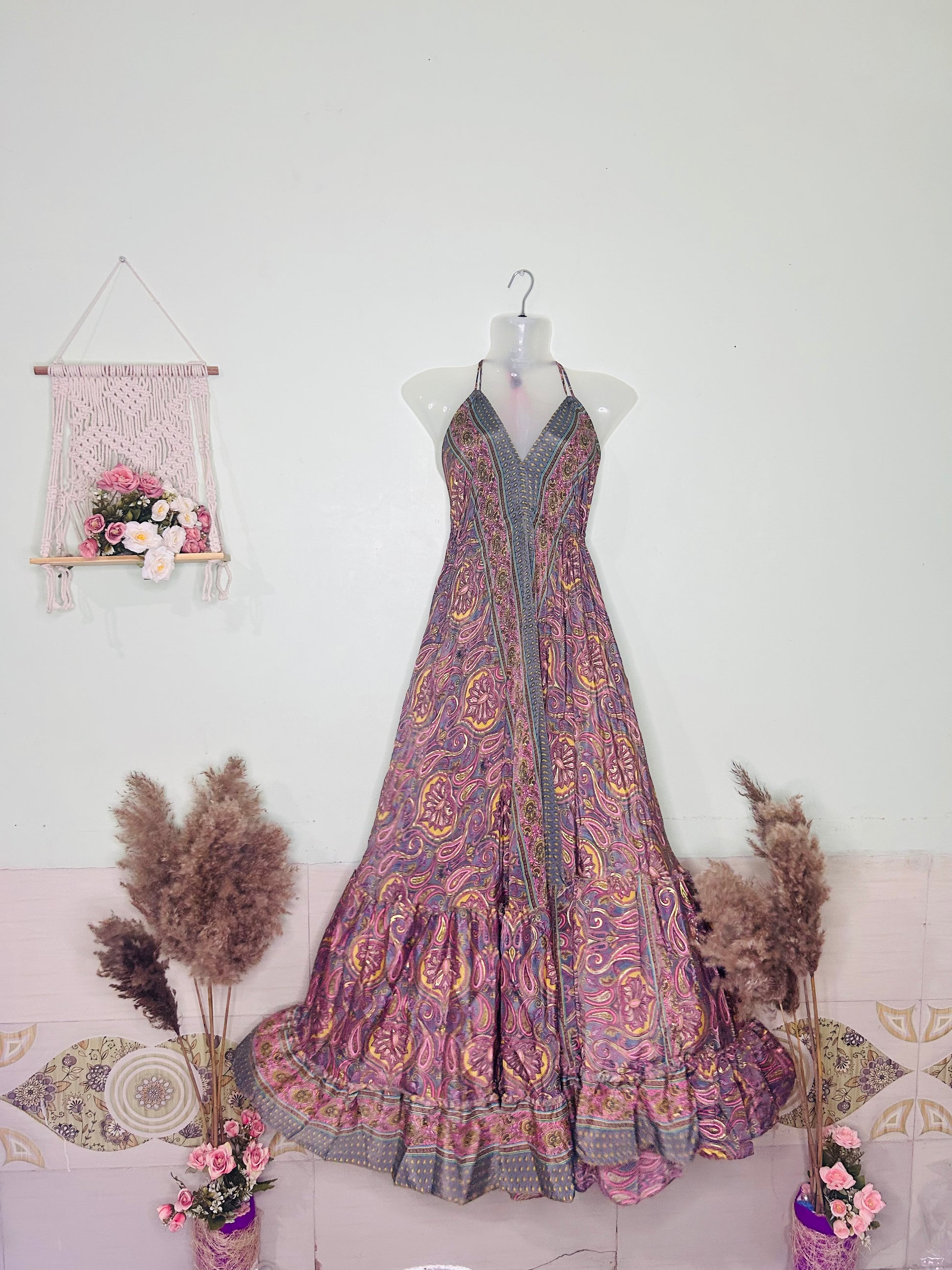 Jaipuri Boho Silk Gown – Maroon Halter Neck Flare Dress